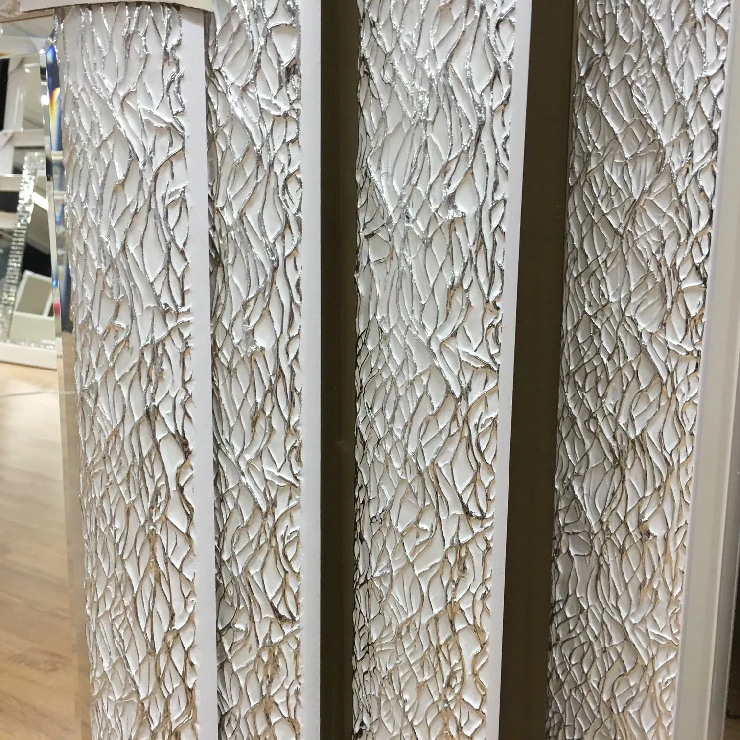 Valkoisella pohjalla hopeista kohokuvionauhaa, fasettihionta.
